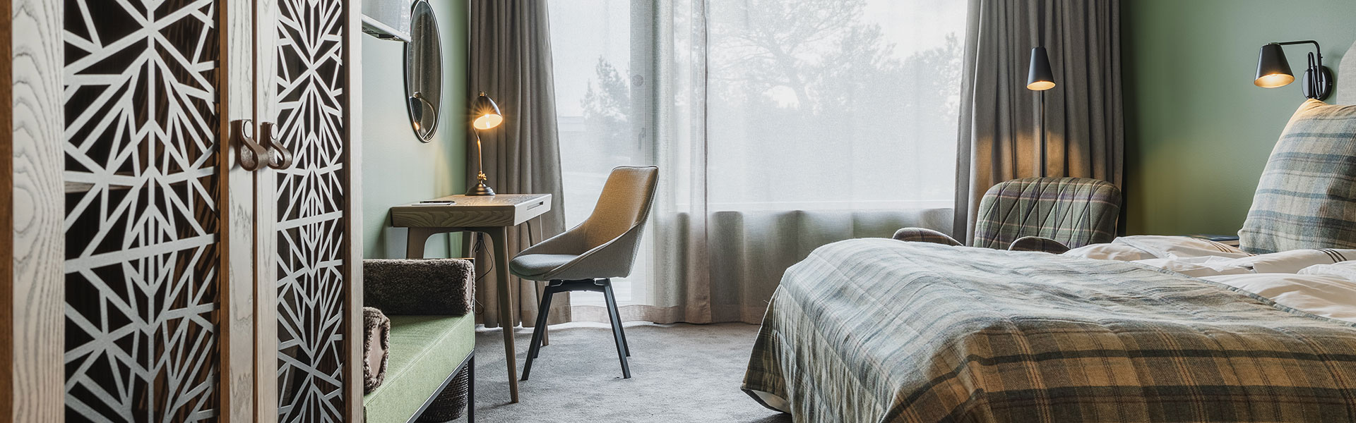 Dubbelrummen i våra fristående hotellhus är inredda i skandinavisk design med genuina material, harmonisk färgsättning och naturen precis utanför fönstret. Rummet har två sängar som kan stå antingen ihop eller isär. Eget badrum och en härlig uteplats. I byggnaden bredvid ligger spaavdelningen och restaurang Bistron. Om du vill besöka spa och vara garanterad bord, boka ett paket där spa och middag ingår.